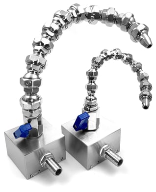 Die Kühlschmierstoffversorgung wird oft vernachlässigt, da sie fälschlicherweise als unwichtig angesehen wird. Dabei trägt die Kühlschmierstoff-Versorgung einen erheblichen Teil zur Prozesssicherheit bei. Es ist daher nicht sinnvoll, auf enge Rohre oder ähnliche Konstruktionen zu setzen, da diese keine ausreichende Versorgung mit Kühlschmierstoff gewährleisten können. Um den Kühlschmierstoff effektiv zur Zerspanstelle zu bringen, empfiehlt es sich, Flachstrahl-/, Rund-/ oder Nadeldüsen zu verwenden. Durch die optimierte Strömung des Kühlschmierstoffs kann der Strahl präzise auf die Zerspanstelle ausgerichtet werden. Zudem sollten sich der Austrittswinkel und die Austrittsgeschwindigkeit genau einstellen lassen, um alle Prozessparameter optimal anzupassen.